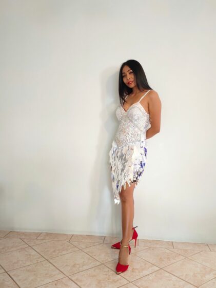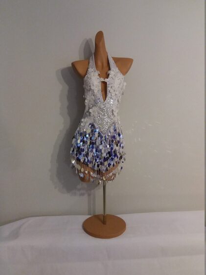 WHITE-Blue/Silver Sequin Beads Dress-Size 8+10 Samba Costumes Carnival Show Girl Las Vegas Notting Hill Pride Parade festival School Brazil-