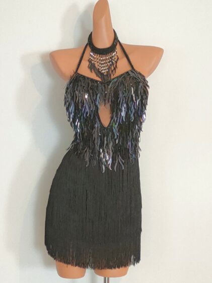 BLACK Fringe / Beads Dress, open back. Incl. beads Choker ! ( Please see all pictures ! )