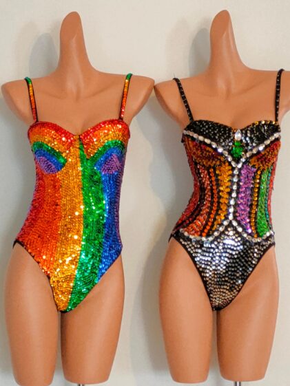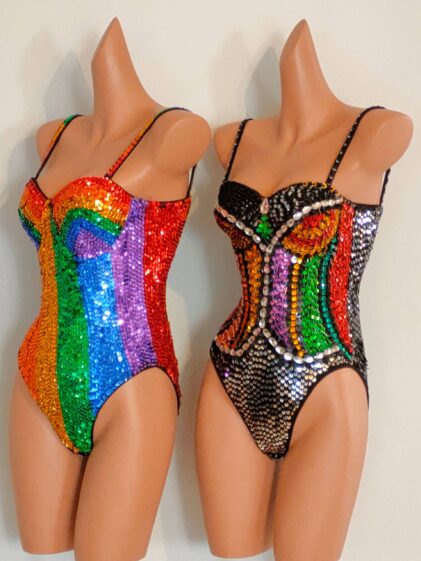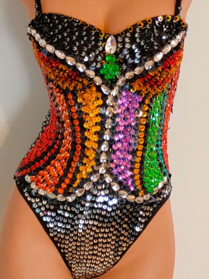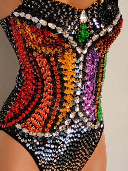 Sequins / Beads /Crystal stones BLACK / RAINBOW color Sequin Design Bodysuit, closed back. ( Please see all pictures ! )