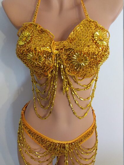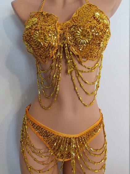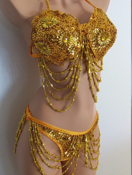 GOLD Beads/Sequins BIKINI, "G-String" bottom, larger padded Bra (good for C to DD cup) ! 2-Piece Set !!! ( Please see all pictures ! )