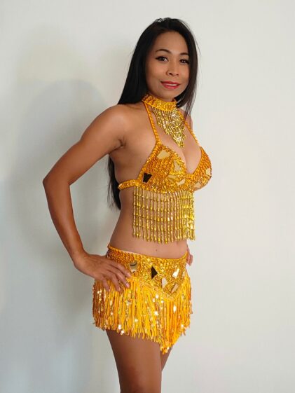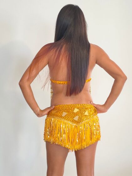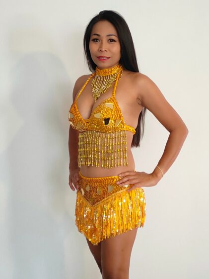 GOLD Fringe, Beads Skirt + Top Set. Incl. beads Choker and padded bra ! 3-Piece Set ! ( Please see all pictures ! )