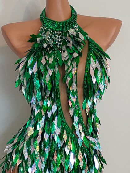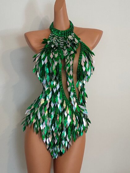 Sequins / Beads GREEN color Sequin Design Bodysuit, open back, with netting insert at the front ! ( Please see pictures 2-4 ! )