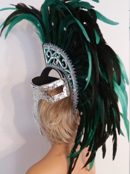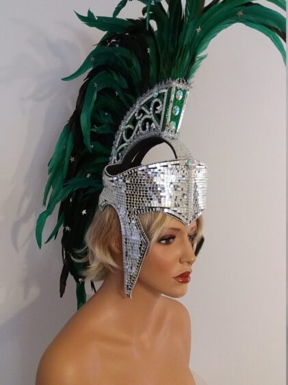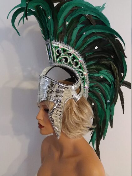 Spartan Headdress with GREEN Feather MOHAWK Headpiece with Silver mirror stones ! ( Please see all pictures ! )