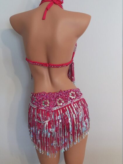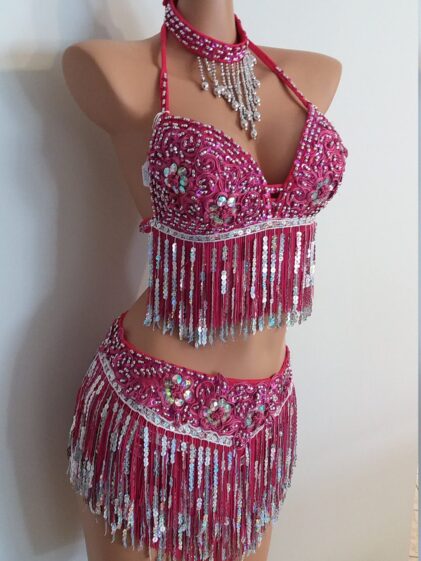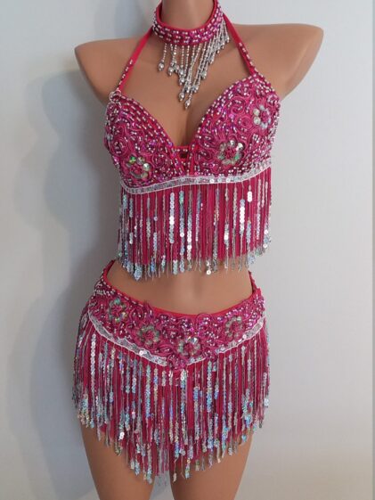 HOT PINK Fringe / Beads Skirt + Top Set. Incl. beads Choker and padded bra ! 3-Piece Set ! ( Please see all pictures ! )
