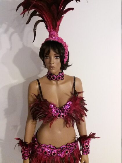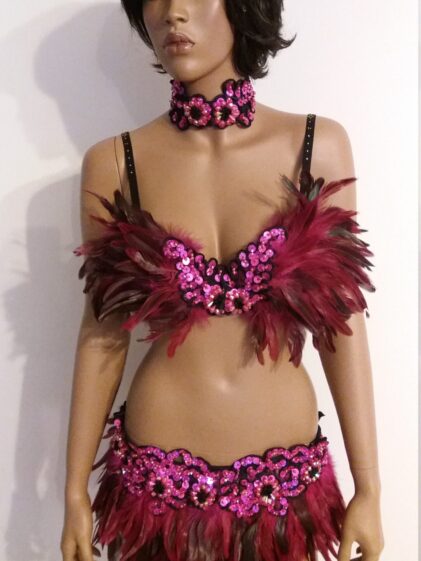 Lovely handmade Sequin/Feather BIKINI, with small beads/sequins, Feather Skirt, padded Bra, Choker – 3-piece Set !