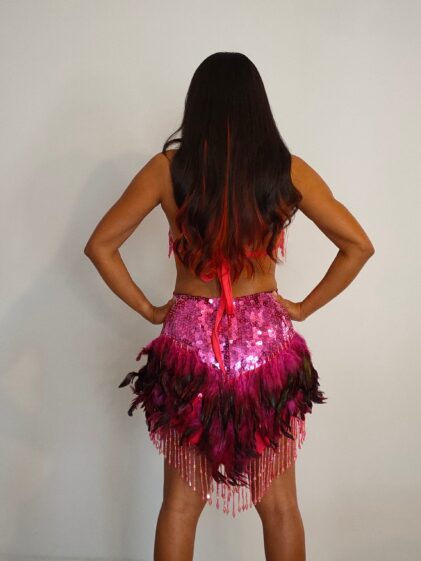 Lovely shaped handmade Sequin Dress with real Rooster Feathers.