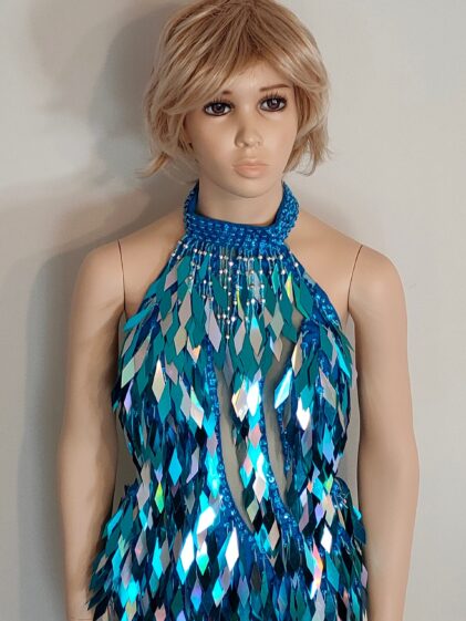 TURQUOISE color Sequin/Beads Design Bodysuit, open back, with netting insert at the front ! ( Please see all pictures ! )