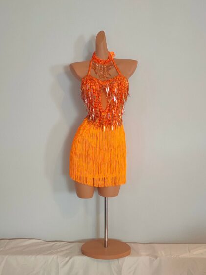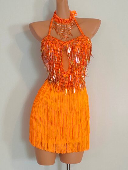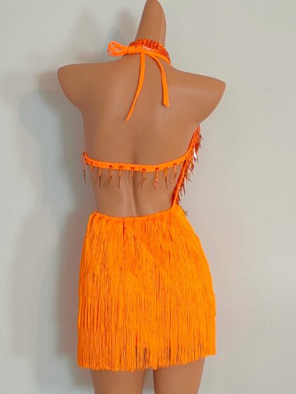 ORANGE Fringe / Beads Dress, open back. Incl. beads Choker !  ( Please see all pictures ! )