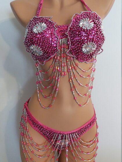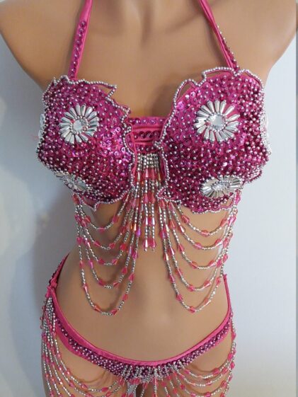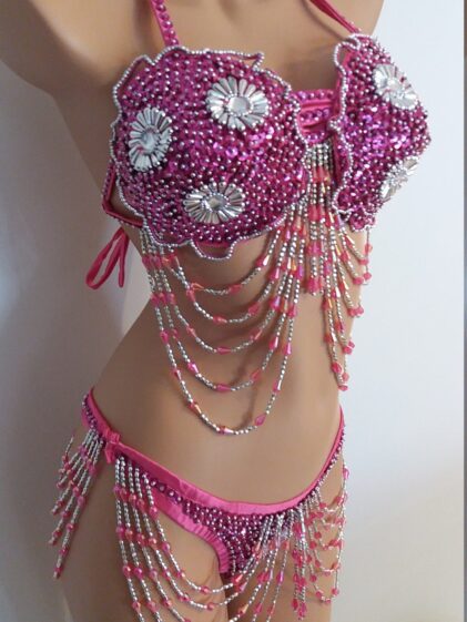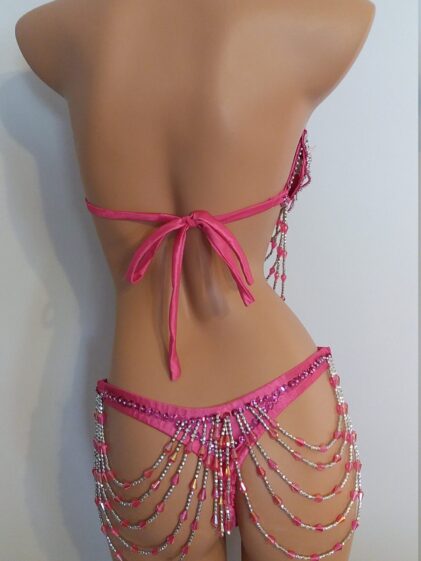 PINK Beads/Sequins BIKINI, "G-String" bottom, larger padded Bra (good for C to DD cup) ! 2-Piece Set !!! ( Please see all pictures ! )