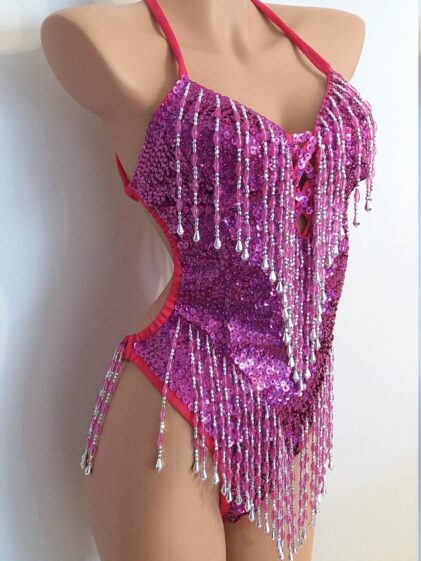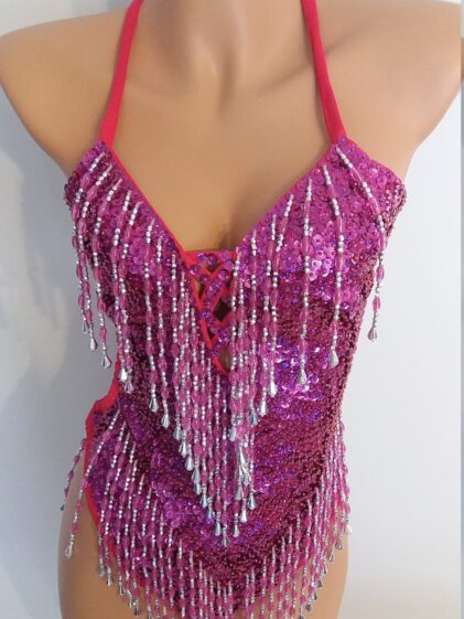 HOT PINK Beads, Sequins Leotard/Bodysuit, "G-String" bottom! ( Please see all pictures ! )