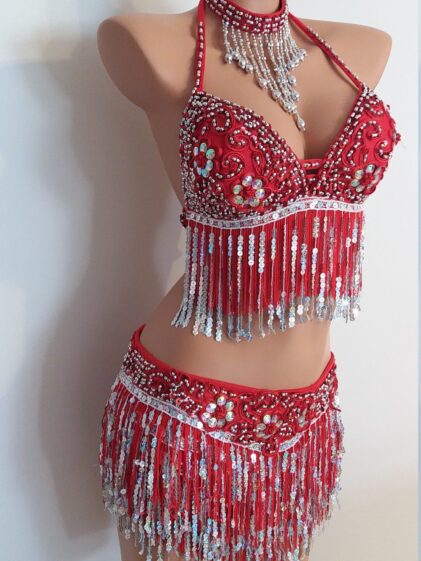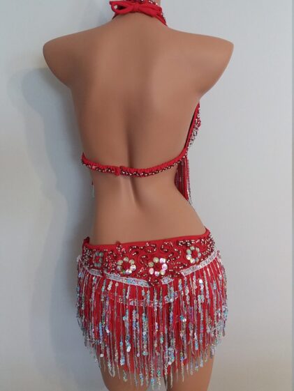 RED Fringe / Beads Skirt + Top Set. Incl. beads Choker and padded bra ! 3-Piece Set ! ( Please see all pictures ! )