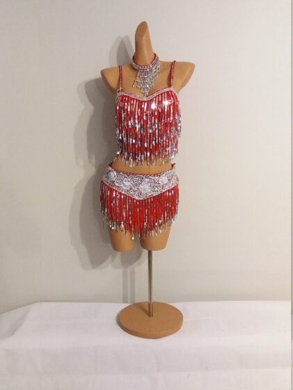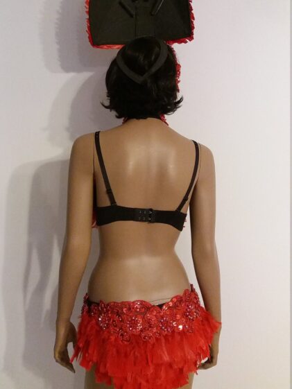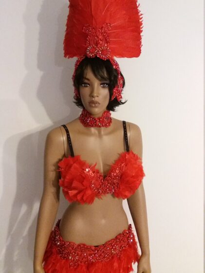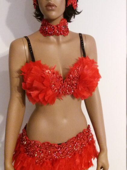 RED Beads with RED Feather BIKINI, includes the Feather Skirt, padded Bra + Choker ! 3-Piece Set !!! ( Please see all pictures ! )