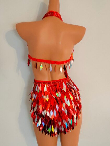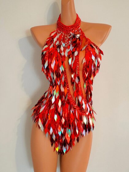 Sequins / Beads RED color Sequin Design Bodysuit, open back, with netting insert at the front ! ( Please see pictures 2-4 ! )