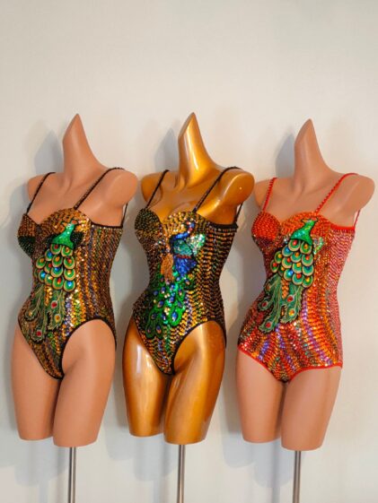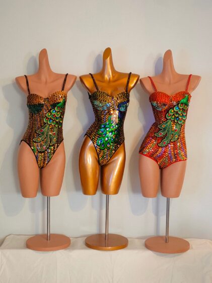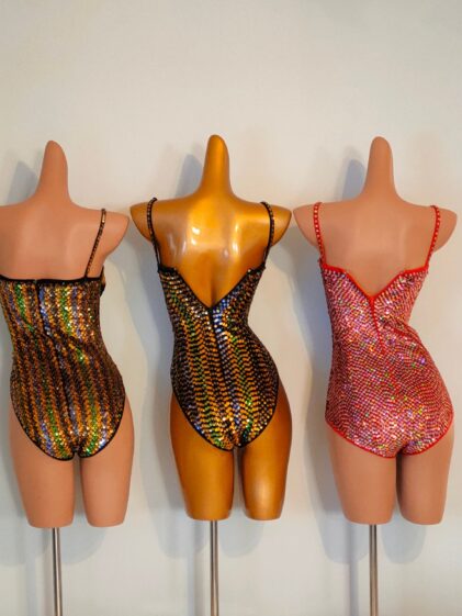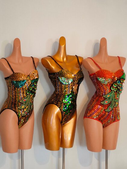 This Red Sequin Peacock Bodysuit has a "full brief" cut, the other available colors have a higher leg cut ! (Please look at all pictures)