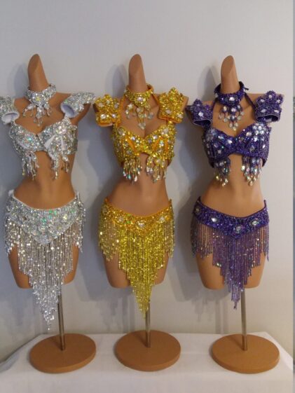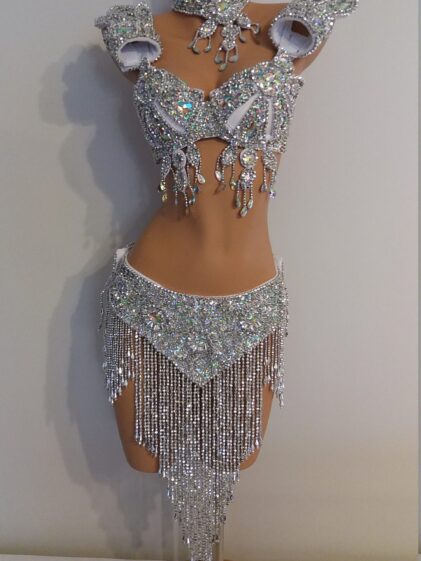 Lovely handmade Sequin / Beads Skirt and matching Bra, comes with choker and wrist cuffs ! – 5-piece Set !