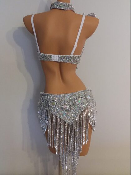 SILVER Sequin / Beads Skirt + Top Set, comes with choker, wrist cuffs and padded bra ! 5-Piece Set ! ( Please see all pictures ! )