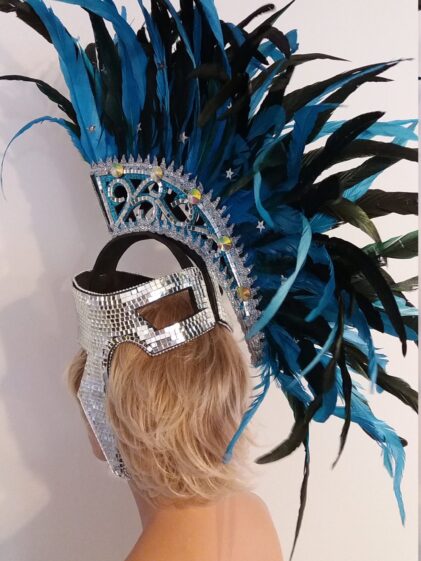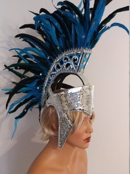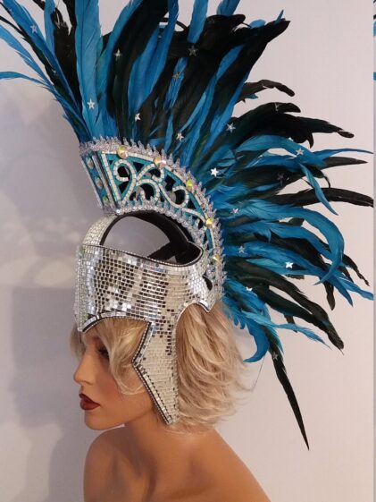Spartan Headdress with TURQUOISE Feather MOHAWK Headpiece with Silver mirror stones ! ( Please see all pictures ! )