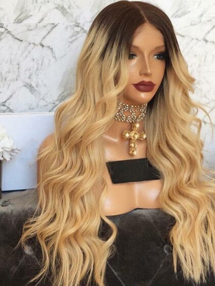 Extremely natural looking non lace, Wavy style wig in the color light Blonde with dark roots ( please see picture ).