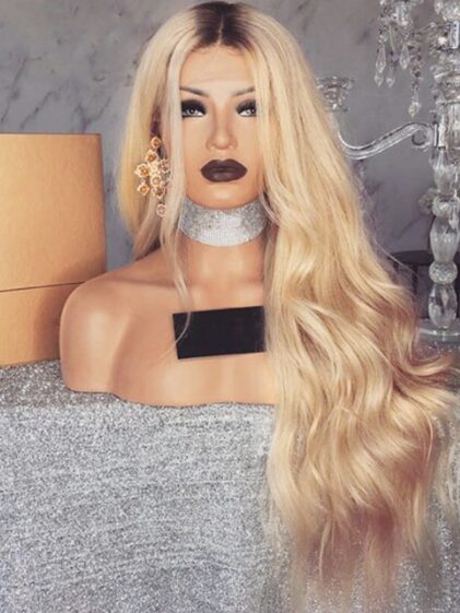 Extremely natural looking non lace, Wavy style wig in the color light Blonde with dark Roots ( please see picture ).