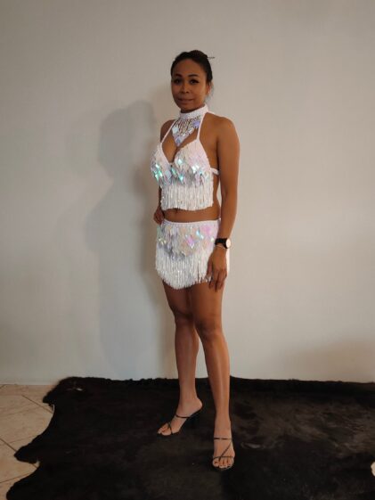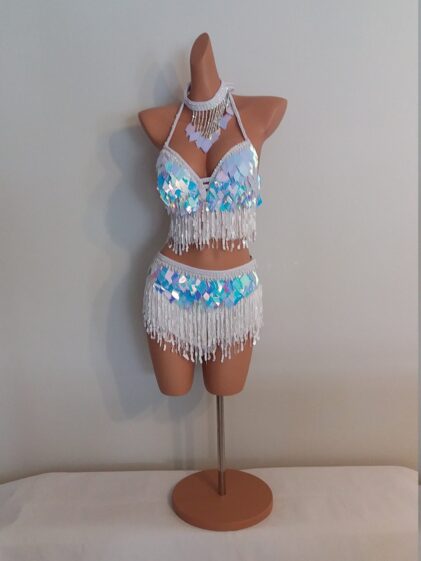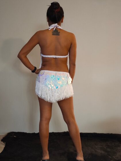 WHITE Fringe, large Beads Skirt + Top Set. Incl. beads Choker and padded bra ! 3-Piece Set ! ( Please see all pictures ! )