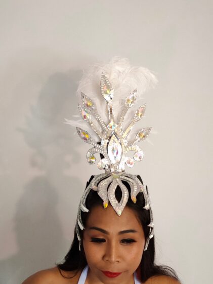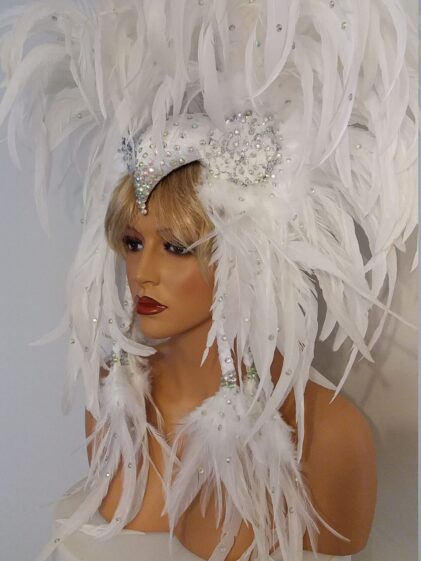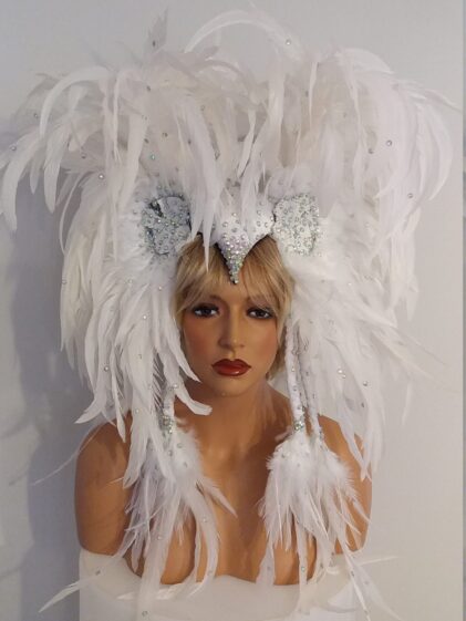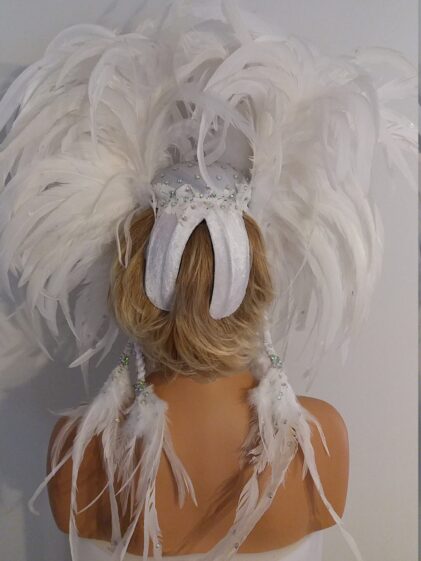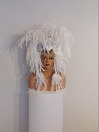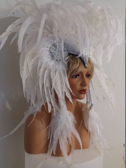 WHITE “MAYA” Feather Headpiece-Headdress Samba Costumes Carnival-Mardi Gras-Show Girl-Cabaret-Vegas-Cabaret-Drag Queen Brazilian-KS-Maya-W