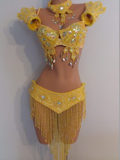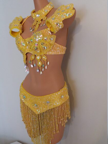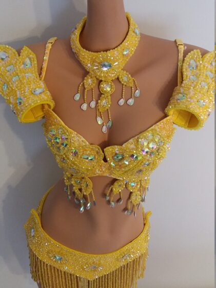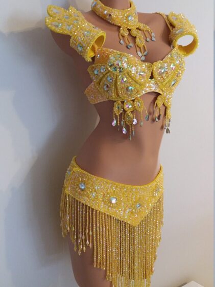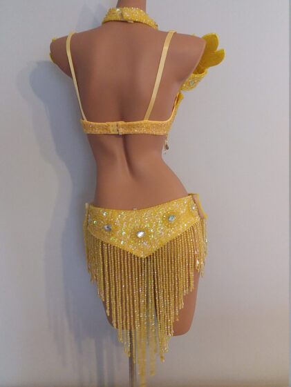 YELLOW Sequin / Beads Skirt + Top Set, comes with choker, wrist cuffs and padded bra ! 5-Piece Set ! ( Please see all pictures ! )